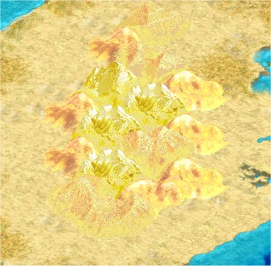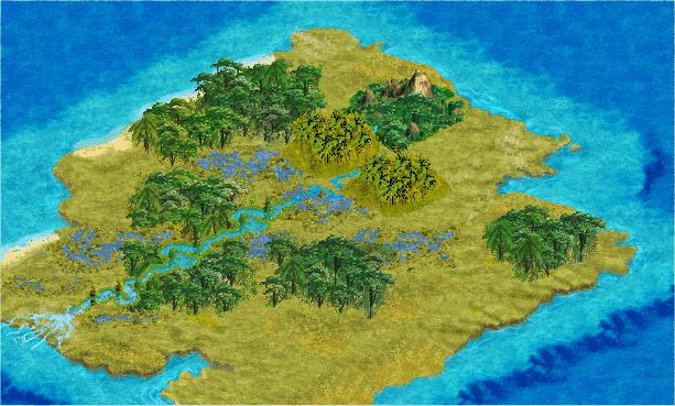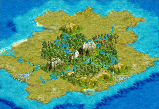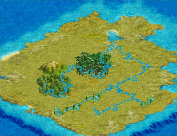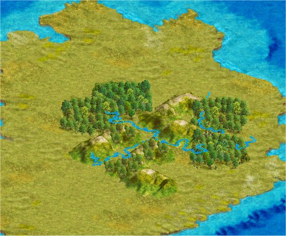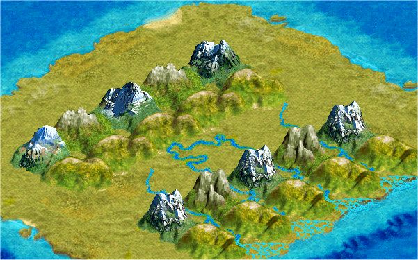 mountainous terrain, and rivers on 3 sides of tile
